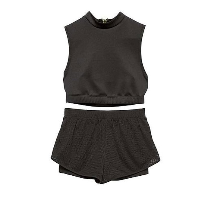 La colección gymwear está compuesta por prendas realizadas con materiales tecnológicos que permiten una mejor transpiración y regulan la temperatura de cuerpo. Principalmente veremos shorts, crop tops, leggins y sudaderas. Todo en colores neutros como el negro pero con toques de colores flúor, tan presentes en las prendas deportivas.