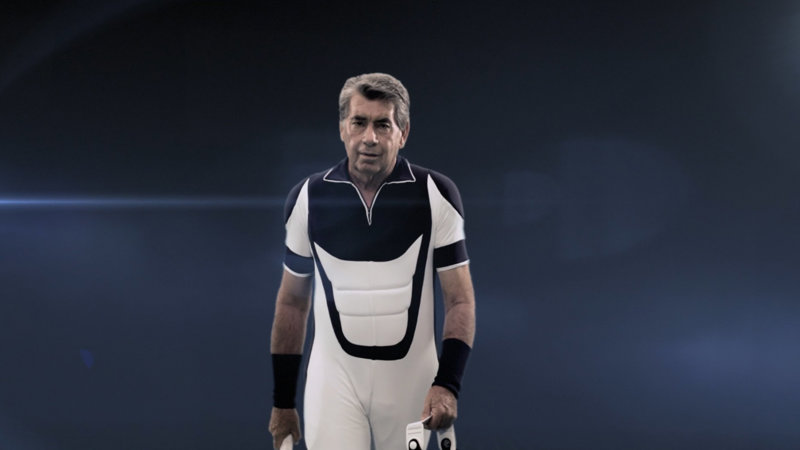 Manolo Santana vestido furista para el spot del laboratorio Normon