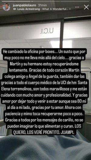 El prometido de Nuria Fergó, Juan Pablo Lauro, en el hospital debido a un "susto" que casi le lleva "más allá del cielo"
