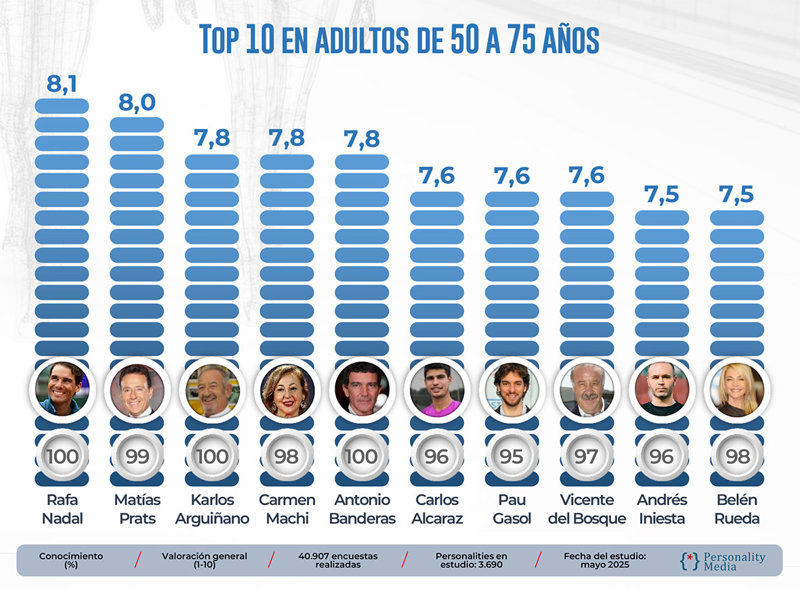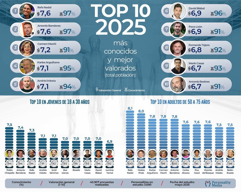 Rafa Nadal continúa siendo el gran referente intergeneracional: El más conocido y valorado por los españoles
