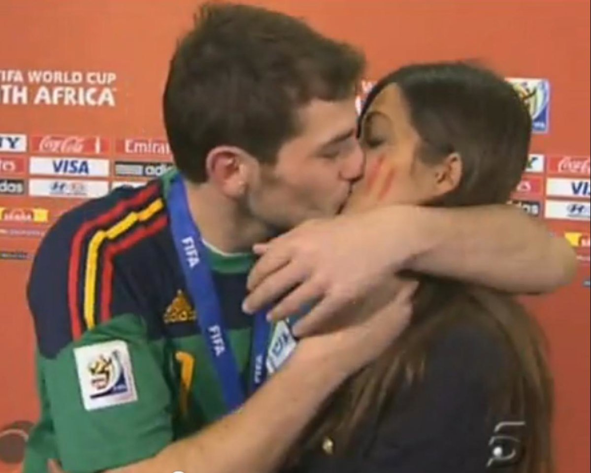 El domingo se cumplieron las predicciones del pulpo Paul y España se alzaba con la copa que les galardonaba como el mejor equipo del mundo. Después de numerosos abrazos, risas y llantos, el capitán de la Selección, entrevistado por su pareja, la periodista Sara Carbonero, no pudo reprimir sus sentimientos y proclamó a los cuatro vientos su amor con un espontáneo beso.