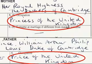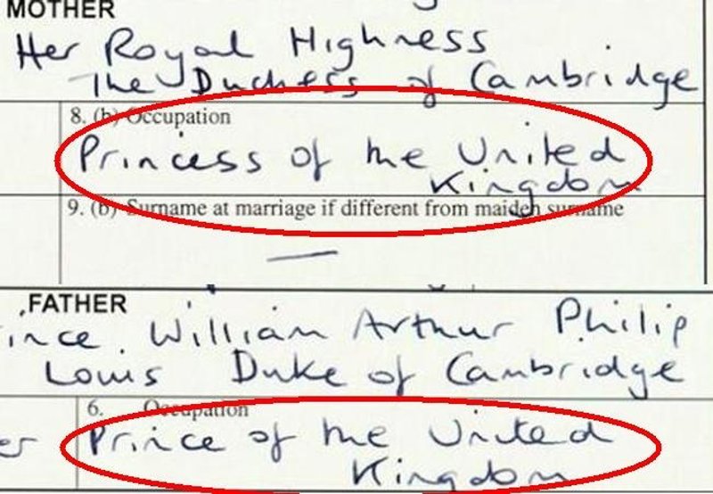 ¿Que os imagináis que han puesto al rellenar el certificado de nacimiento de su hijo los Duques de Cambridge? Pues para empezar, en ocupación han puesto príncipe y princesa de U.K; ¡cómo si no lo supiéramos!