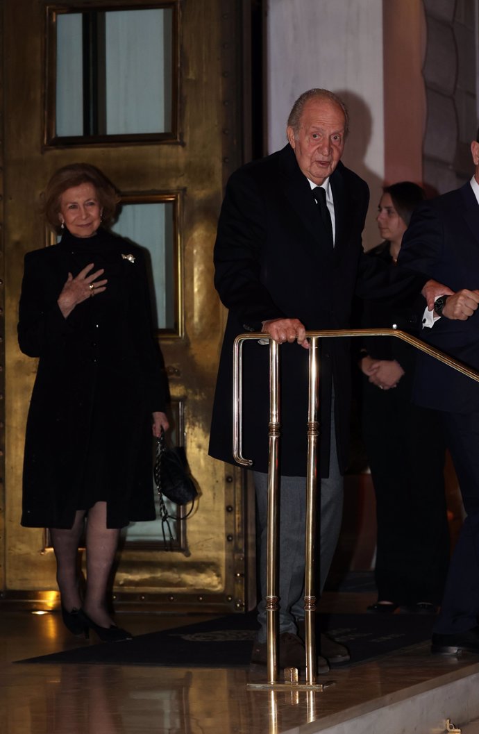 Momentos después, el rey emérito salía caminando con la ayuda de su bastón y apoyándose en uno de los miembros de seguridad. Junto a la reina emérita, salían del encuentro saludando amablemente a los allí presentes con una gran sonrisa.