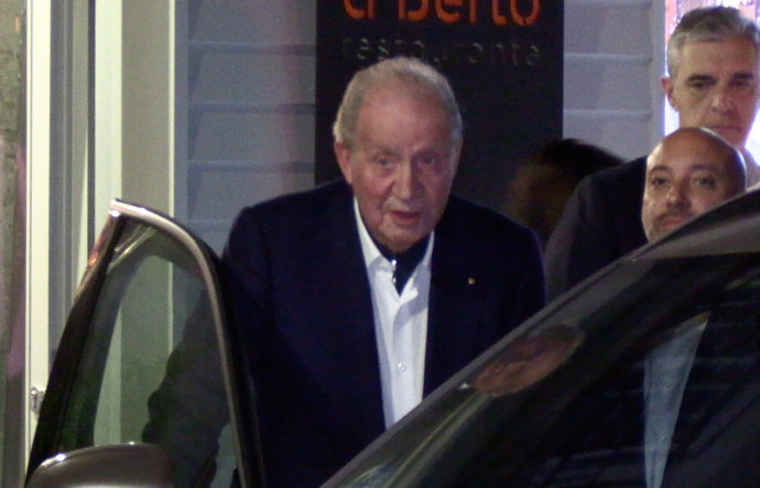 En esta ocasión don Juan Carlos abandonaba la casa de su amigo Pedro Campos para acudir a uno de sus restaurantes preferidos de la zona, Marisquería D'Berto, para reunirse con algunos de sus amigos con los que disfrutó de una agradable velada antes del comienzo este fin de semana de la Liga Nacional de la clase 6 metros en el Real Club Náutico. Especialmente relajado y sonriente, el Emérito abandonaba las instalaciones del restaurante con ayuda de su personal de seguridad que le acompañó hasta el coche que le iba a llevar de regreso a casa.