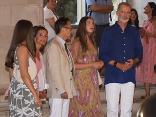 En el caso de la reina Letizia, se decantaba por un sencillo diseño de tirantes en color rosa con fruncidos en la parte del pecho y falda fluída. Lo combinaba con alpargatas planas en color blanco y boslo estilo sobre también en los mismos tonos. Por su parte, la princesa Leonor optaba por un sencillo vestido recto de tirantes en color verde con estampado de palmeras sobre fondo en verde. En cuanto a los complementos, la joven elegía bolso en beige con detalle en marrón sobre el hombro y menorquinas de piel también en marrón. Su hermana, la infanta Sofía, elegía un vestido de manga corta y escote a pico con detalles 'cut out' en los costados y volante en la parte baja de la falda. Al igual que su mujer y sus hijas, también el Rey optaba por un estilismo muy relajado y característico de sus días en la isla con pantaló blanco y camisa azul a juego con las alpargatas.