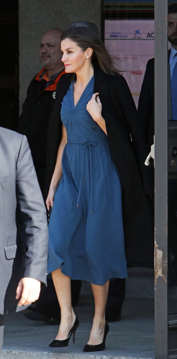 Esta vez, Su Majestad ha lucido este vestido midi de Bottega Veneta azul petróleo y de manga corta con unos stilettos negros y un abrigo del mismo color, que llevaba sobre los hombros a su llegada al Teatro Real. Una vez dentro, Doña Letizia se lo ha quitado para que pudiéramos ver bien el acertadísimo look que había escogido para la ocasión.