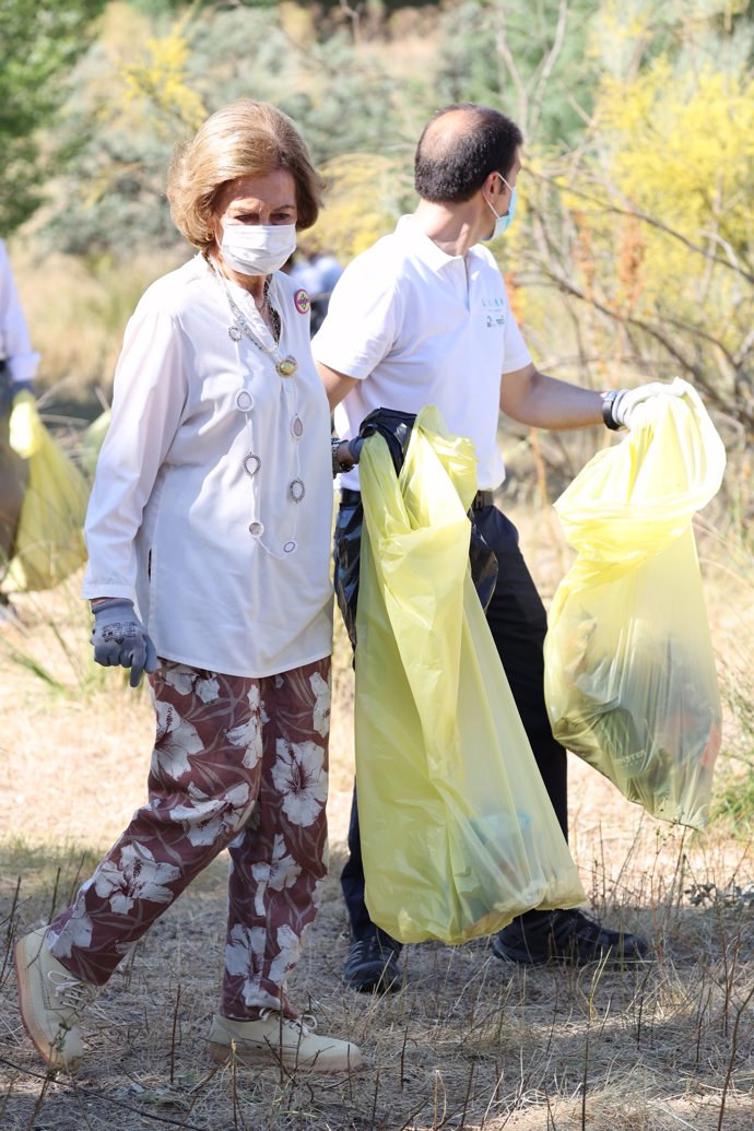 Aunque se trata de una actividad al aire libre y en pleno campo, Doña Sofía ha lucido un estilismo estupendo, primaveral, pero sobre todo cómodo. Una blusa de color blanco roto con unos pantalones florales y unas deportivas. Acompañada por el director ejecutivo de Ecoembes, Óscar Martín, y el director de organización de SEO/BirdLife, Miguel López, ha estado recogiendo todos estos residuos olvidados en la naturaleza.