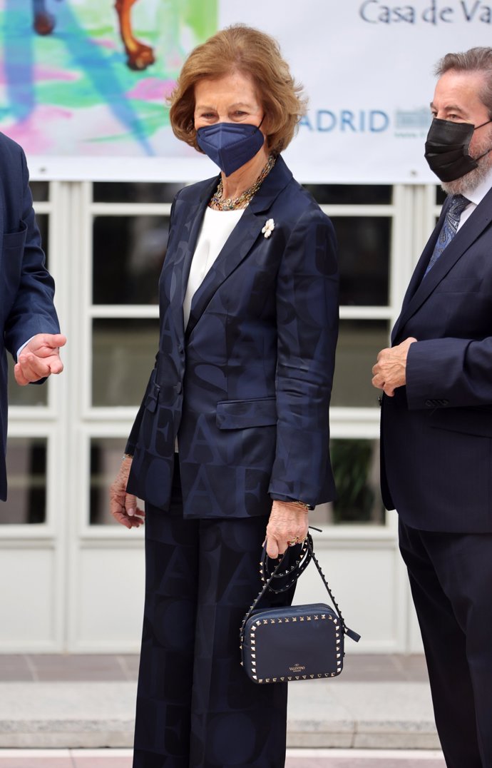 Para este evento, Doña Sofía ha optado por un look con el que le vimos este mismo año en mayo cuando, después de no asistir a la confirmación de su nieta Leonor por las restricciones de la Covid, reapareció en el Teatro Monumental de Madrid. Se trata de un traje de pantalón y chaqueta azul, con un estampado de letras. Combinado con un bolso Rockstud de Valentino azul marino con tachuelas, que ella ha llevado como bolso de mano.