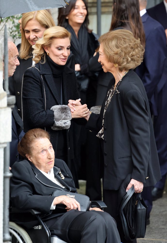 Doña Sofía aprovechaba el momento para hablar con la infanta Margarita y María Zurita. La madre del rey Felipe le daba la mano a la hija de Carlos Zurita en un gesto amable y las dos sonreían. A su lado, la infanta Cristina aprovechaba para hablar con Carlos Zurita. La infanta Cristina y doña Sofía se marchaban juntas, no sin antes saludar a los allí presentes que les despedían al grito de '¡Viva la reina Sofía!'.