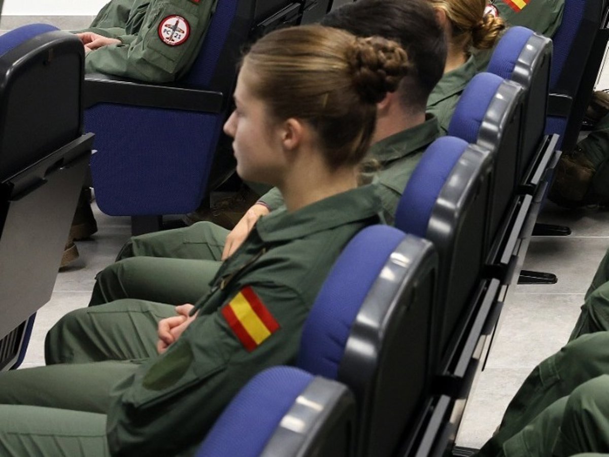 Nuevas fotografías de la Princesa Leonor en la Academia General del Aire (AGA) de San Javier, Murcia, con el resto de sus compañeros. Vestida con el característico mono de trabajo verde y su moño trenzado, la heredera acudió a una conferencia presidida por la ministra de defensa.