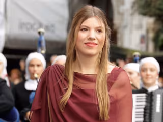 La hija menor de los Reyes ha apostado por un vestido de la firma Miphai, siguiendo así los pasos de su madre y de su hermana, ambas fieles defensoras del made in Spain. La Infanta Sofía ha elegido el modelo Ámbar, confeccionado en crepe y en uno de los tonos estrella de la temporada.