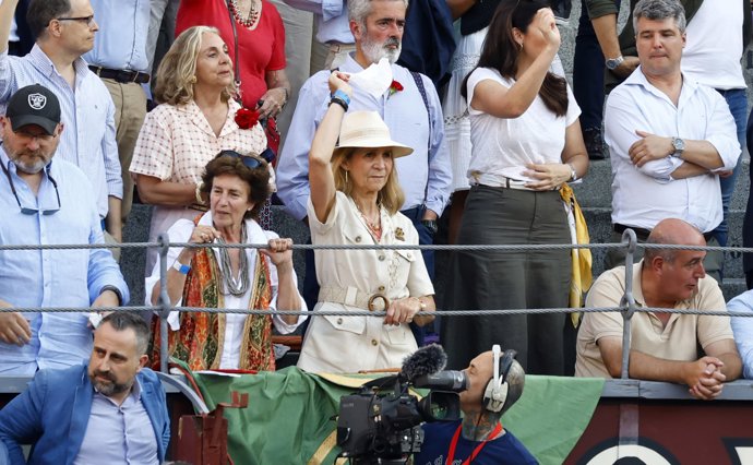 De lo más animada durante toda la corrida, la hermana de Felipe VI aplaudió y alentó al ganadero Victorino Martín para que saliese a hombros de Las Ventas como parte del homenaje a su padre, agitando su pañuelo blanco sin dejar de sonreír.