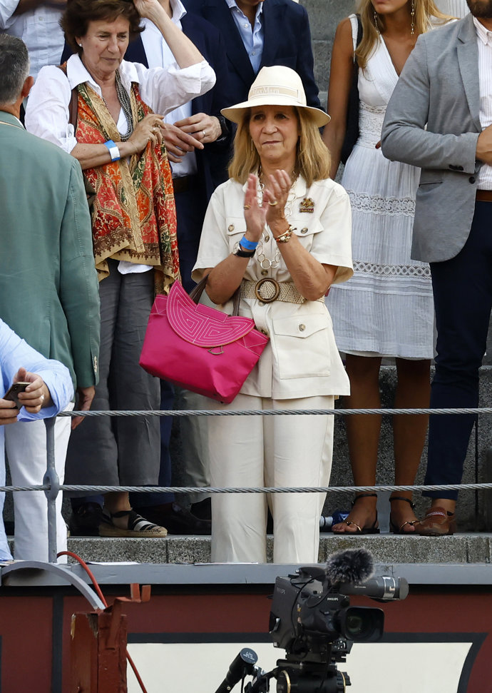 Dando una gran importancia a los complementos, de los que es una enamorada, doña Elena ha completado su favorecedor estilismo con un borsalino también en color blanco, maxi gafas de sol, collar de eslabones metalizados, un llamativo broche en la solapa, alpargatas de cuña a tono con el resto del conjunto, y dos detalles que ponen de manifiesto su pasión por el mundo taurino: bolso y abanico en color rosa fucsia inspirados en un capote, haciendo así un guiño muy especial a la Fiesta Nacional.