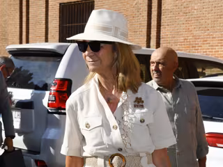 Acompañada por su íntima amiga Rita Allendesalazar, la hija del Rey Juan Carlos ha destacado una vez más por su elegancia con un total look blanco impecable. En clave veraniega, la madre de Victoria Federica ha escogido un dos piezas de pantalón fluido y chaqueta de manga corta con multibolsillos de inspiración sahariana, que ha combinado con un cinturón ancho de rafia en color crema con hebilla redonda de carey para marcar silueta.