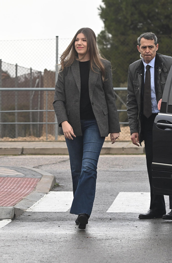 Confirmando su personalidad propia y su gusto por la moda en lo que a sus looks en sus apariciones públicas se refiere, Sofía ha lucido unos jeans oscuros ligeramente acampanados -de máxima tendencia esta temporada-, un top negro de punto con escote redondo, y una favorecedora blazer que nos ha recordado a la Reina Letizia puesto que ha llevado modelos similares en varias ocasiones: un diseño estructurado en color gris jaspeado, con solapas clásicas y detalle de bolsillos frontales.