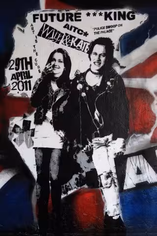 Envueltos en los colores de la bandera de Reino Unido y bajo un rótulo que reza 'Futuro Rey', el afamado pintor callejero ha dibujado a Guillermo y su prometida ataviados con un look de lo más roquero, al más puro estilo de Sid Vicious, vocalista de la conocida banda musical, y su novia Nancy Spungen.
