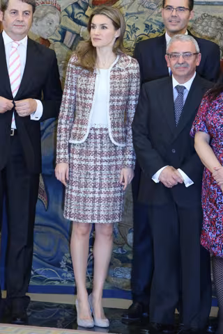Para la ocasión, doña Letizia lució el mismo traje de 'tweed' en tonos marrones, blancos y rojos que llevó el Día de la Hispanidad. La princesa lo combinó con un jersey de cuello redonde en color crema y zapatos de tacón en tono beige.