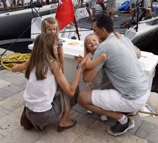 En cuanto las niñas vieron a su padre empezaron a gritar: "¡Papi, papi!" y el príncipe, nada más bajarse del velero, abrazó a sus dos pequeñas. Después de dar un tímido beso a su mujer, todos subieron a bordo. Una vez arriba, mientras Sofía se sentaba tranquilamente en el regazo de su padre, Leonor no paró de corretear y juguetear por toda la cubierta.