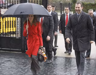 A su llegada a Felechosa (Aller) la Princesa de Asturias ha captado todas las miradas de los allí presentes por un sencillo motivo: su abrigo. Doña Letizia ha querido romper la sobriedad del día con un espectacular abrigo rojo que escondía bajo un enorme paraguas, que portaba ella misma. Por su parte Don Felipe ha aguantado la lluvia, caminando al lado de su mujer pero fuera del paraguas, con tal de que Letizia no se mojase.