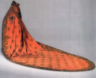 El manto es una pieza histórica confeccionada en el siglo XVIII en seda carmesí que cuenta con unos bordados heráldicos en oro y plata de una extraordinaria singularidad. El grado de conservación es excelente, ya que la prenda está forrada por dentro de seda blanca con armiño de uso exclusivo de la realeza.