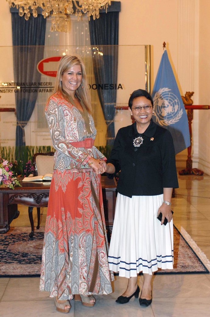 Ha visitado Indonesia como representante especial del Secretario General de las Naciones Unidas para la Inclusión Financiera y el Desarrollo del país. En este viaje, de tres días, la reina fue recibida por jóvenes estudiantes.