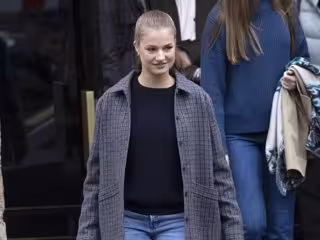 Por su parte, la Princesa Leonor se ha dejado ver con un outfit súper juvenil, de tonos oscuros, formado por jeans relajado de pernera ancha, jersey azul marino y blazer oversize con estampado de cuadros.