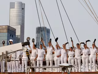El Juan Sebastián Elcano hacía su llegada a la ciudad de los rascacielos a ritmo de pasodoble y con la Princesa Leonor, junto al resto de guardamarinas y con el uniforme de verano blanco de la Armada, saludando con su mejor sonrisa desde la cubierta de la embarcación, emocionada porque su paso por la 'Gran Manzana' pone fin a una de las experiencias más intensas y enriquecedoras de su vida.