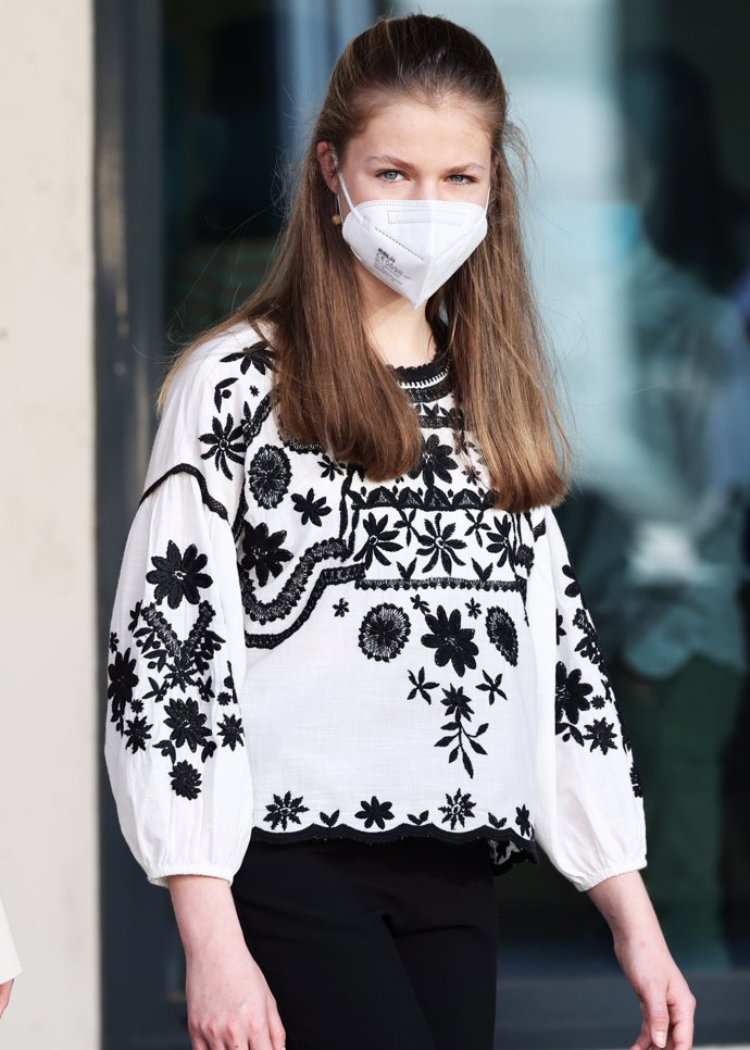 La Princesa Leonor lucía una blusa de color blanco con motivos étnicos en color negro, en conmemoración con el pueblo ucraniano, mientras que Doña Letizia vestía pantalón blanco y chaqueta negra. La Infanta Sofía escogió una blusa estampada en color blanco y azul, a juego con el traje de Don Felipe VI.