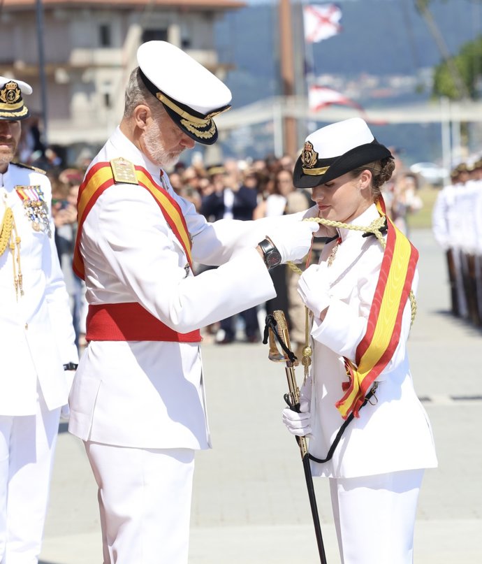 Emoción a flor de piel en el solemne acto con el que la Princesa Leonor ha puesto punto y final este miércoles, ante la orgullosa mirada de los Reyes Felipe y Letizia, y de la Infanta Sofía, a su paso por la Escuela Militar Naval de Marín tras haber concluido su formación castrense en La Armada.