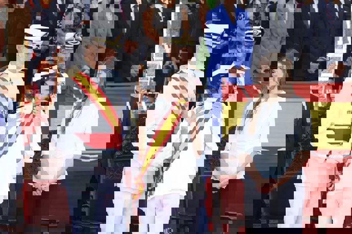 Tras la imposición de la Gran Cruz del Mérito Naval, la heredera a la Corona se ha reencontrado con el resto de la familia para presenciar la jura de bandera de los alumnos de la Escuela Naval de Marín, y el orgullo tanto de Doña Letizia como de Sofía al abrazar cariñosamente a Leonor con su mejor sonrisa se ha convertido en una de las escenas más emotivas de la jornada.