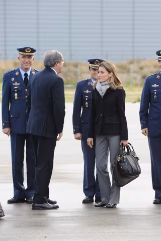 En los pies, manoletinas negras con hebilla dorada, con las que sin duda estaría pasando un poquito de frío, pero para remediarlo Letizia se colocó una maxi bufanda gris en el cuello.