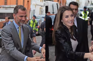 Con traje de chaqueta gris a rayas, camisa azul y corbata en tonos pistacho, así vestía el Príncipe Felipe. Por su parte Doña Letizia ha optado por un look mucho más roquero; cazadora de cuero negro con hombreras, cuerpo rosa palo con topitos, falda negra por encima de la rodilla con un pliegue lateral y salones con tiras al tobillo en nude. Para completar su outfit Doña Letizia ha elegido un clutch en rosa palo y negro.