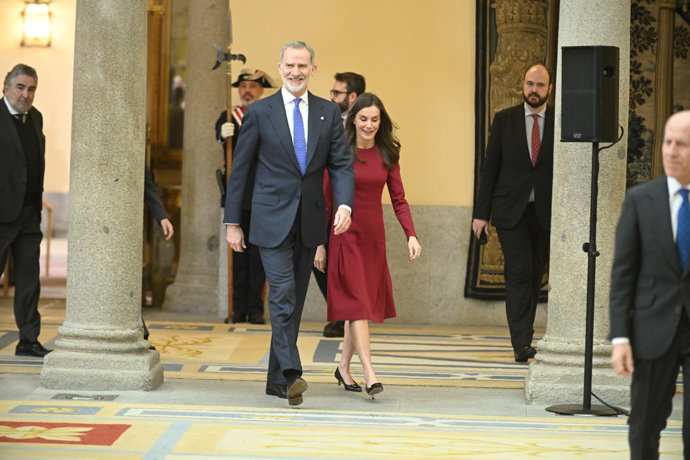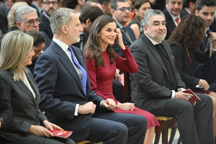 Unos premios en los que, al margen del impecable look escogido por la Reina, que ha rescatado el favorecedor vestido en color burdeos con falda tableada de vuelo que estrenó en su visita en solitario al Reino Unido en abril de 2022 para inaugurar una exposición sobre Zurbarán junto al Rey Carlos III -entonces Príncipe de Gales-, ha destacado la complicidad que han mostrado sus Majestades, que no han dejado de intercambiar miradas y confidencias durante el acto.