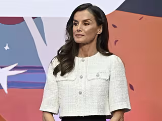 Para esta ocasión, la monarca ha estrenado una chaqueta ideal para esta época del año confeccionada en tweed, de corte crop, de manga corta en color blanco con botones plateados.