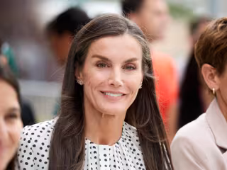 Renovando su vestidor en este inicio de 'curso' tan intenso para la Monarca, ha estrenado una blusa de pequeños lunares irregulares en negro sobre fondo blanco de Hugo Boss, con cuello redondo plisado, manga larga y cierre frontal mediane botones ocultos, confirmando así que los 'polka dots' vuelven con más fuerza que nunca (aunque nunca se fueron) este otoño.