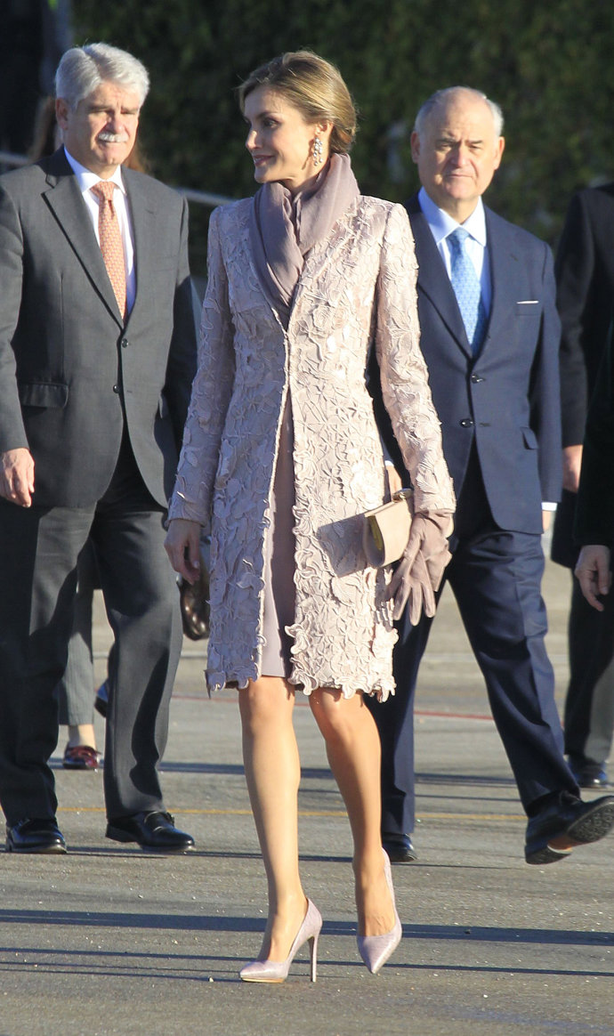 La Reina Letizia ha aparecido con un look sofisticado y elegante compuesto por un abrigo de flores bordadas en color rosa palo que ha combinado perfectamente con todos sus complementos. Una vez más ha vuelto a decantarse por unos bonitos stilettos y un clutch alargado.