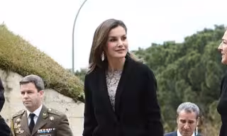 Para el acto, que tuvo lugar en el Teatro del Bosque de Móstoles, la Reina Letizia lució uno de los looks más clásicos que se le recuerdan en los últimos meses: abrigo negro, pantalón del mismo color y blusa beige de guipur.