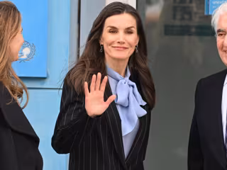Tirando de fondo de armario, Doña Letizia ha rescatado un traje sastre azul marino de raya diplomática de Hugo Boss que estrenó en octubre de 2022 durante su viaje de Estado a Alemania; un dos piezas con pantalón recto y blazer larga con hombreras marcadas y cierre con un solo botón, que ha combinado con una sofisticada blusa azul bebé de seda con lazada XL en el cuello, similar a la que lució -en este caso en blanco- cuando acudió a despedir a la Princesa Leonor a Cádiz antes de comenzar su crucero de instrucción militar a bordo del Juan Sebastián Elcano el pasado 11 de enero.