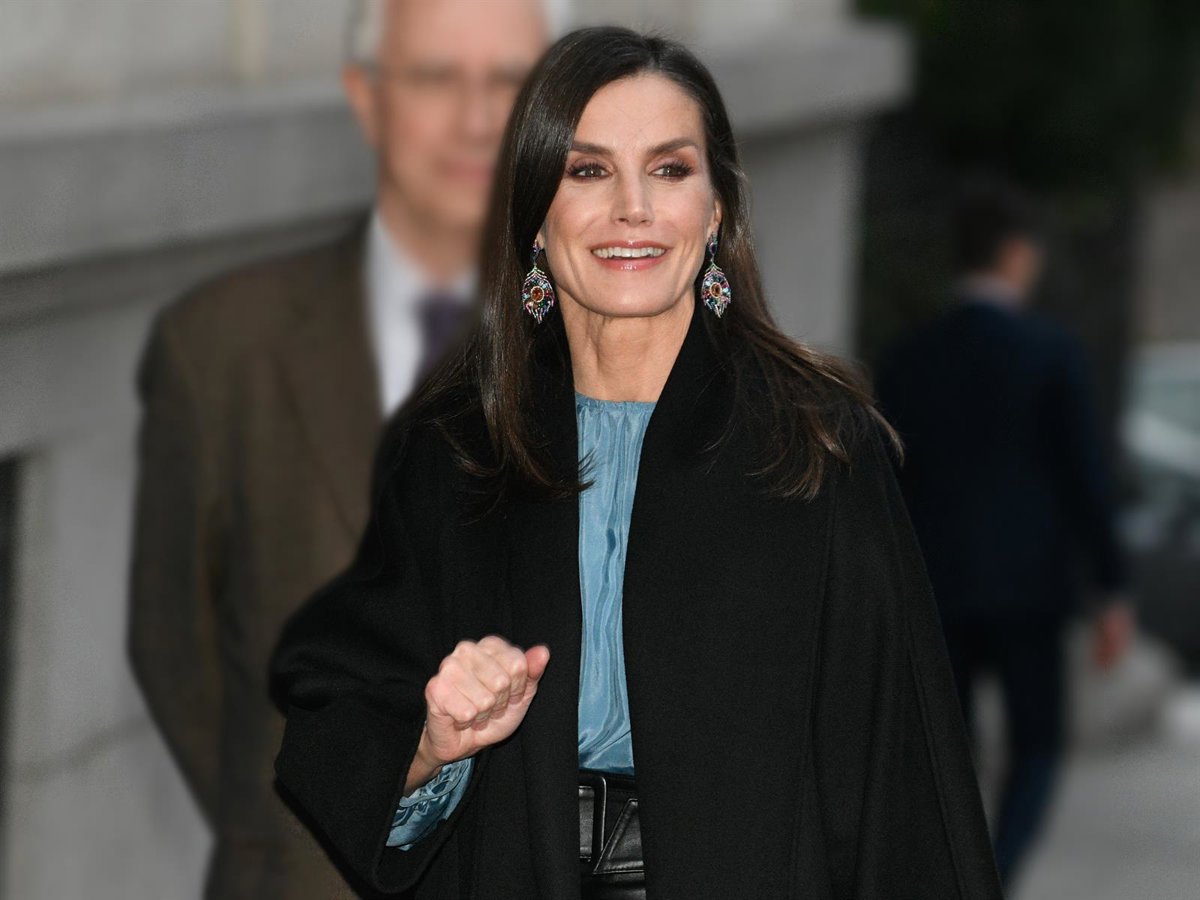 La Reina Letizia ha lucido en esta cita un estilismo elegante e ideal para combatir el frío que está haciendo en la capital. Para ello, ha optado por una falda midi de cuero en color negro de Hugo Boss y una blusa de seda azul turquesa de la firma Carolina Herrera (al igual que el mini bolso). Todo ello combinado con un abrigo de paño con cierto toque oversize, también en color negro.