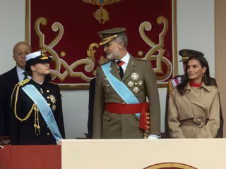 La princesa Leonor, el Rey Felipe VI y la Reina Letizia durante el acto solemne de homenaje a la Bandera Nacional y desfile militar por el 12 de octubre, Día de la Hispanidad, en la Plaza de Cánovas del Castillo, a 12 de octubre de 2024, en Madrid (España - ALEJANDRO MARTÍNEZ VÉLEZ / EUROPA PRESS