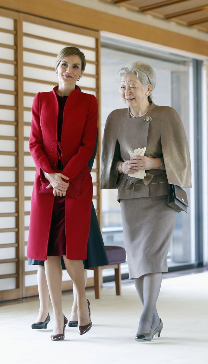 Si al bajar del avión su look fue de lo más sofisticado con de tubo de cuero, stilettos y chaqueta negra y beige, en su encuentro con los emperadores Akihito y Michiko, los herederos Naruhito y Masako y el primer ministro Shinzo Abe en el Palacio Imperial de Tokio tampoco ha defraudado.