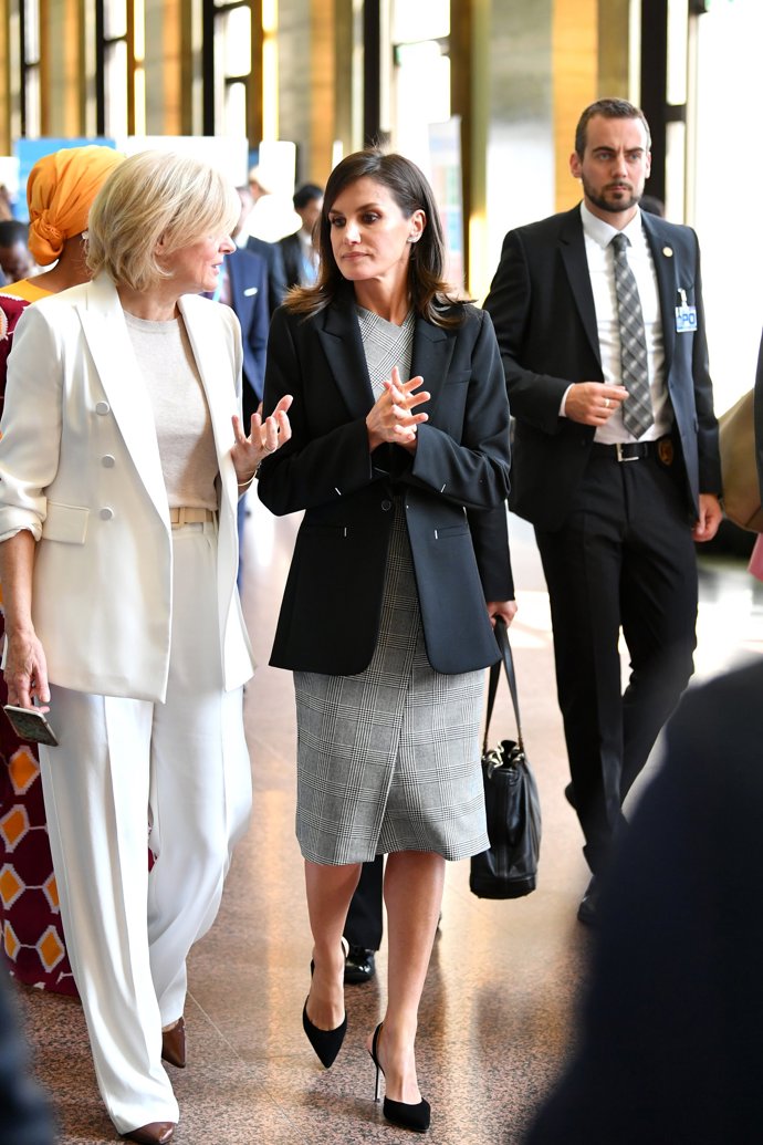 Para la ocasión, la Reina Letizia se ha convertido en la viva imagen de la sobriedad con un vestido recto con estampado príncipe de Gales que utiliza para sus eventos más serios, con una americana negra de cortes rectos y unos stilettos destalonados en el mismo color.