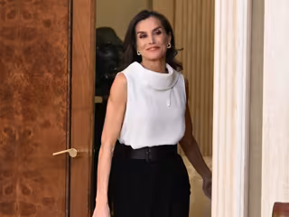 Para la ocasión, la monarca ha estrenado look. Un estilismo bicolor, en blanco y negro -con el que ha vuelto a demostrar su elegancia- formado por una falda negra de tubo con cinturón ancho, de largo midi, que ha combinado con una blusa sin mangas y cuello fluido en color blanco.