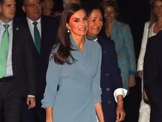 Una cita en la que la Reina, 'aparcando' momentáneamente los estilismos veraniegos que ha lucido en sus últimas apariciones ha apostado por un look de entretiempo con un vestido que, aunque le habíamos visto anteriomente, siempre es un acierto rotundo. Un modelo de Adolfo Domínguez en un color poco habitual en Doña Letizia, un gris azulado de lo más favorecedor, que estrenó hace dos años y con el que hoy ha vuelto a conquistarnos.