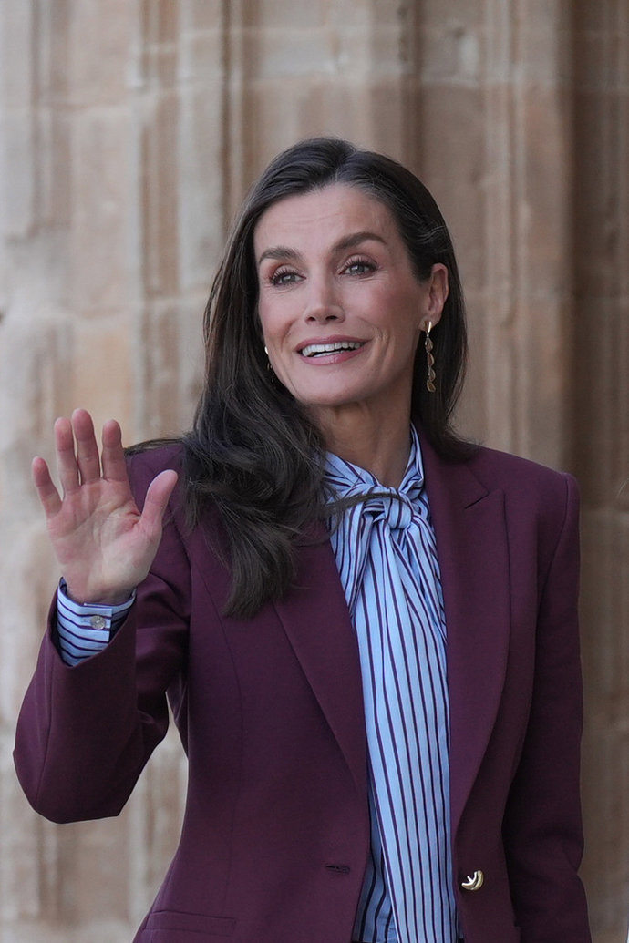 Recurriendo a su fórmula infalible en este tipo de compromisos, Doña Letizia ha recuperado uno de sus trajes más aplaudidos, un precioso dos piezas de la firma Bleis Madrid en color burgundy -que estrenó en 2025 durante su viaje oficial a China- que siempre es una delicia volver a verle, ya que realza al máximo su figura gracias a su blazer entallada de hombros estructurados, solapas clásicas, y cierre con un solo botón joya dorado, y su pantalón de pinzas de silueta recta con pequeñas aberturas en el bajo.