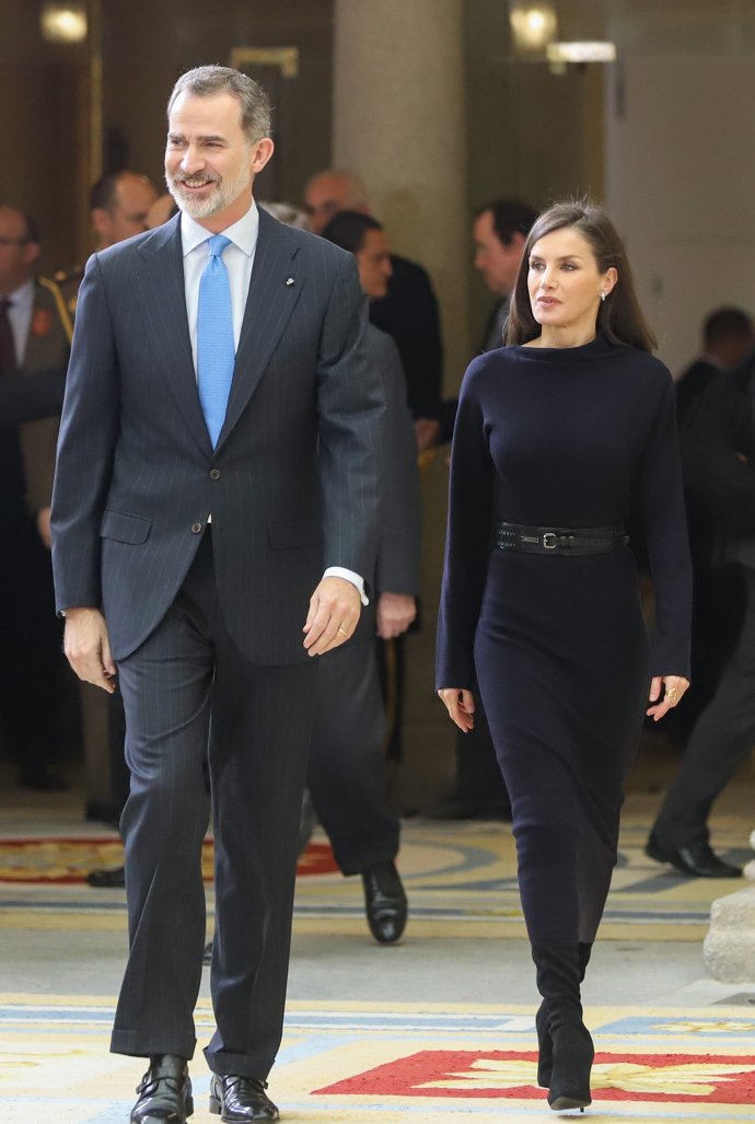 Es un cinturón ancho de cuero con falsas tachuelas el complemento escogido por la Reina para romper con la simpleza de la prenda y añadirle un toque moderno y desenfadado a su look, que además destaca uno sus mejores atributos: la cintura de avispa. Como punto final, Letizia ha escogido unas botas altas de Steve Maddenen en negro, con tacón de aguja y puntera en pico, y unos aros de oro blanco y diamante de Bvlgari, que la propia marca le regaló con motivo del nacimiento de la Princesa Leonor.