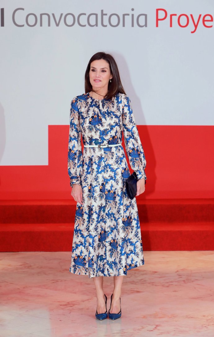 Para la ocasión, Doña Letizia ha estrenado un original vestido blanco con estampado en tonos azules de Sandro París. Se trata de un diseño largo midi en seda, con manga larga y cuello redondo. Un estreno de lo más favorecedor y perfecto para la primavera, que ha combinado con unos salones de piel en color azul y cartera de mano en el mismo tono. En cuanto a las joyas se refiere eligió unos pendientes blancos y el anillo circular que se ha convertido imprescindible en sus últimas apariciones.