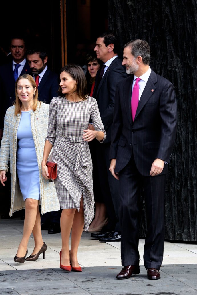 Para esta ocasión la Reina Letizia ha estrenado un look muy acorde con las tendencias de esta temporada y perfecto para el otoño. Se trata de un vestido estampado de cuadros y entallado, con escote caja y acabado desflecado, cinturón de hebilla cuadrada y con una amplia abertura realzada con volantes y que estiliza la figura de Su Majestad. Un diseño de Pedro del Hierro que la monarca ha combinado con abrigo de corte batín en camel, acorde a las bajas temperaturas.