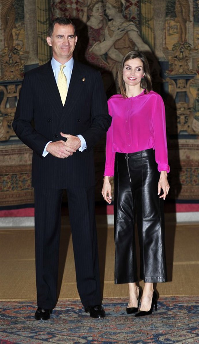 Sus otras prensas estrellas de Uterqüe son los pantalones de corte culotte negros de cuero que hemos podido ver en la reunión que tuvieron los Monarcas con el Patronato de la Fundación Princesa de Asturias. También de negro lució una chaqueta en su visita a Villanueva de los Infantes.