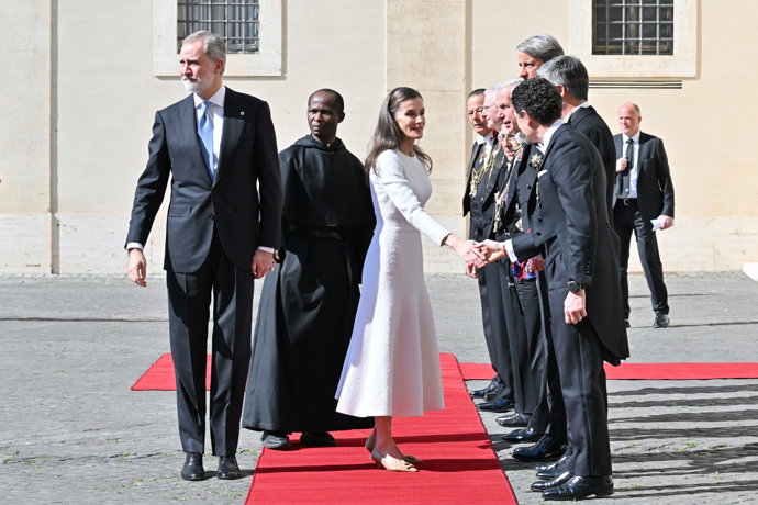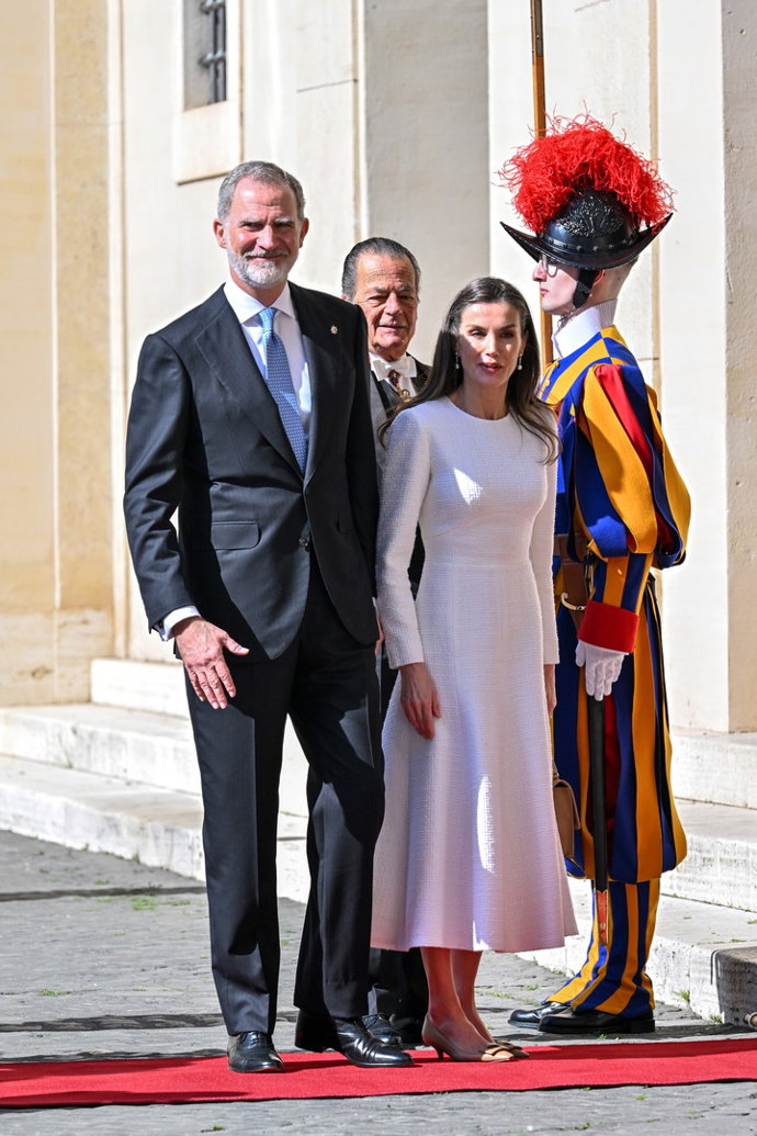 Impecable, y tal y como hizo en su último encuentro con el Pontífice, la Reina Letizia ha hecho uso del llamado 'privilegio blanco', que permite a las mujeres de las Casas Reales católicas -entre las que se encuentran la Reina Sofía, las Reinas Paola y Matilde de Bélgica, Charlène de Mónaco, y las Grandes Duquesas Stèphanie y María Teresa de Luxemburgo- vestir de blanco aunque el protocolo dicte que las mujeres deben vestir de negro en presencia del Papa.